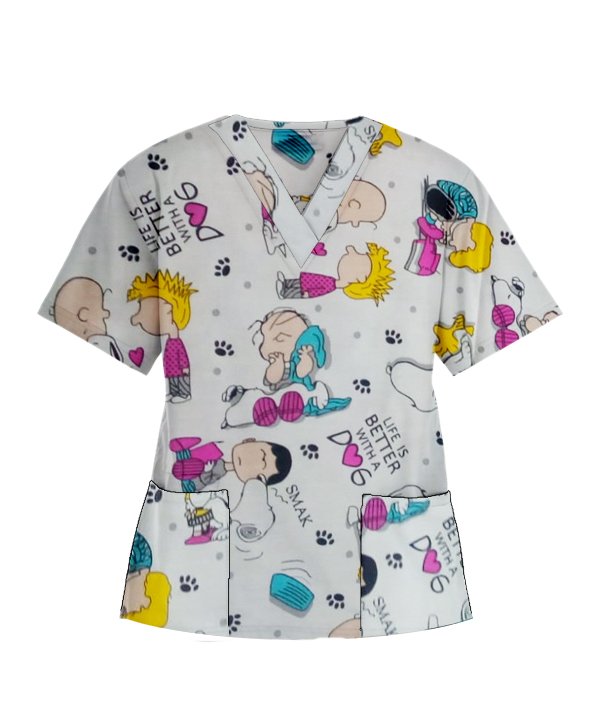 Dog Print Top V Neck 2 Pocket Half Sleeves